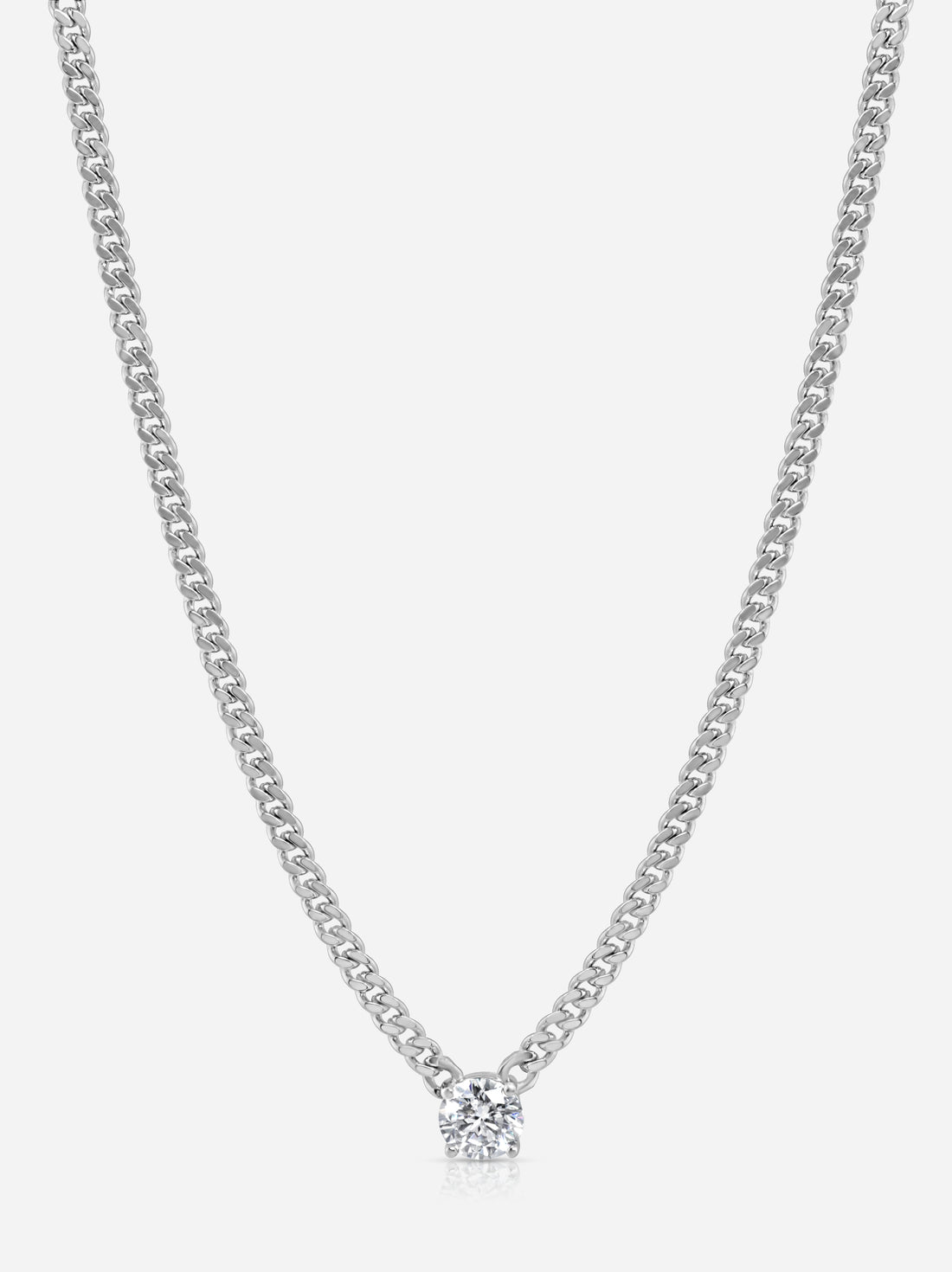 The moissanite stone throws light like a disco ball, set against a bold curb chain...